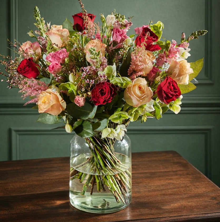 A stunning arrangement of blush pink peach and red roses with delicate seasonal blooms, soft eucalyptus, and elegant foliage. Luxuriously presented with satin ribbon and premium wrapping.